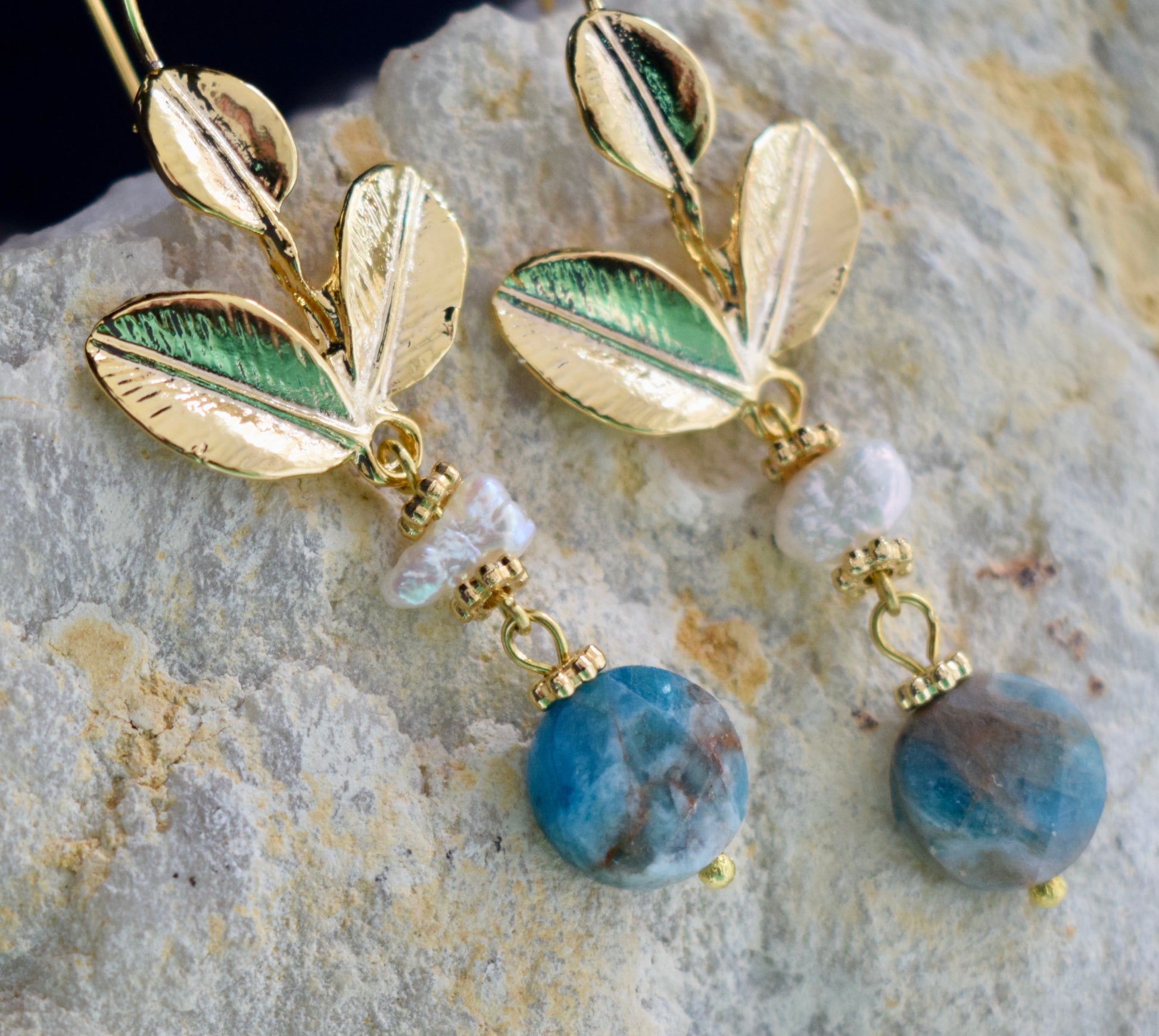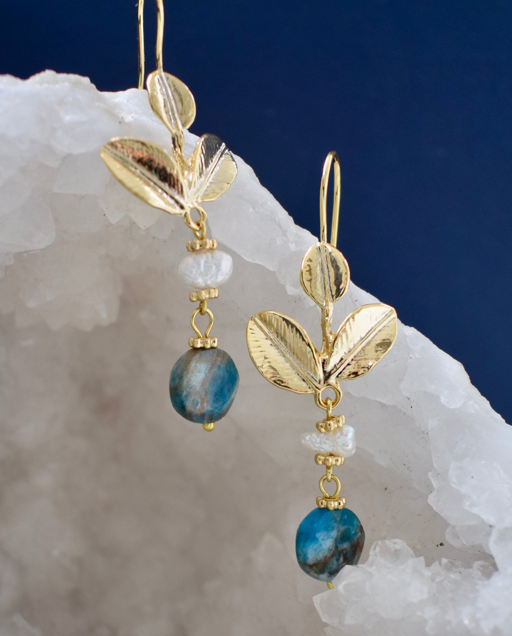 Wat een plaatje, deze prachtige oorbellen. 3 vergulde blaadjes zijn de basis van het ontwerp van deze oorbellen. Daaronder hangt een echte parel en onderaan siert een geslepen lapis lazuli. De totale lengte is 6 cm. De steen heeft een breedte van 8 mm.