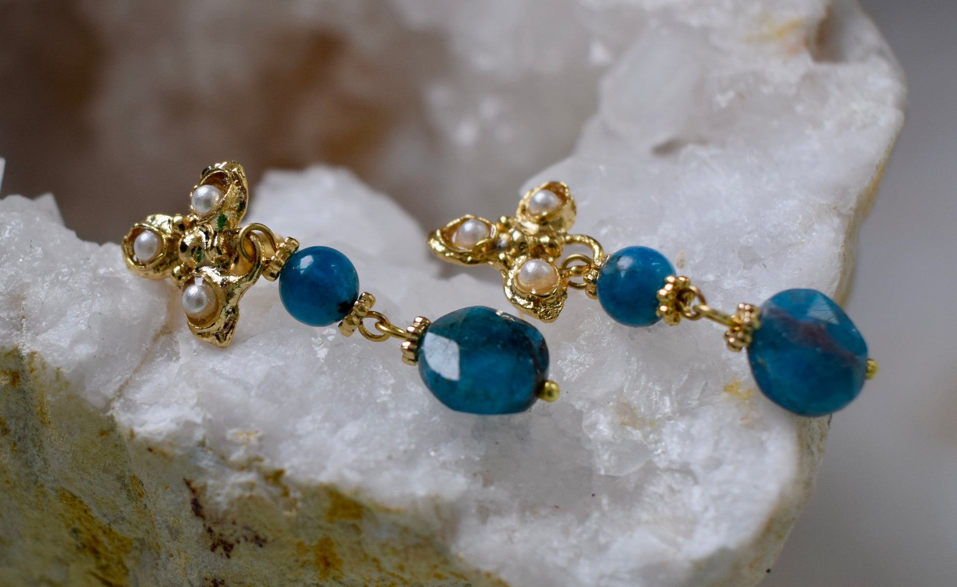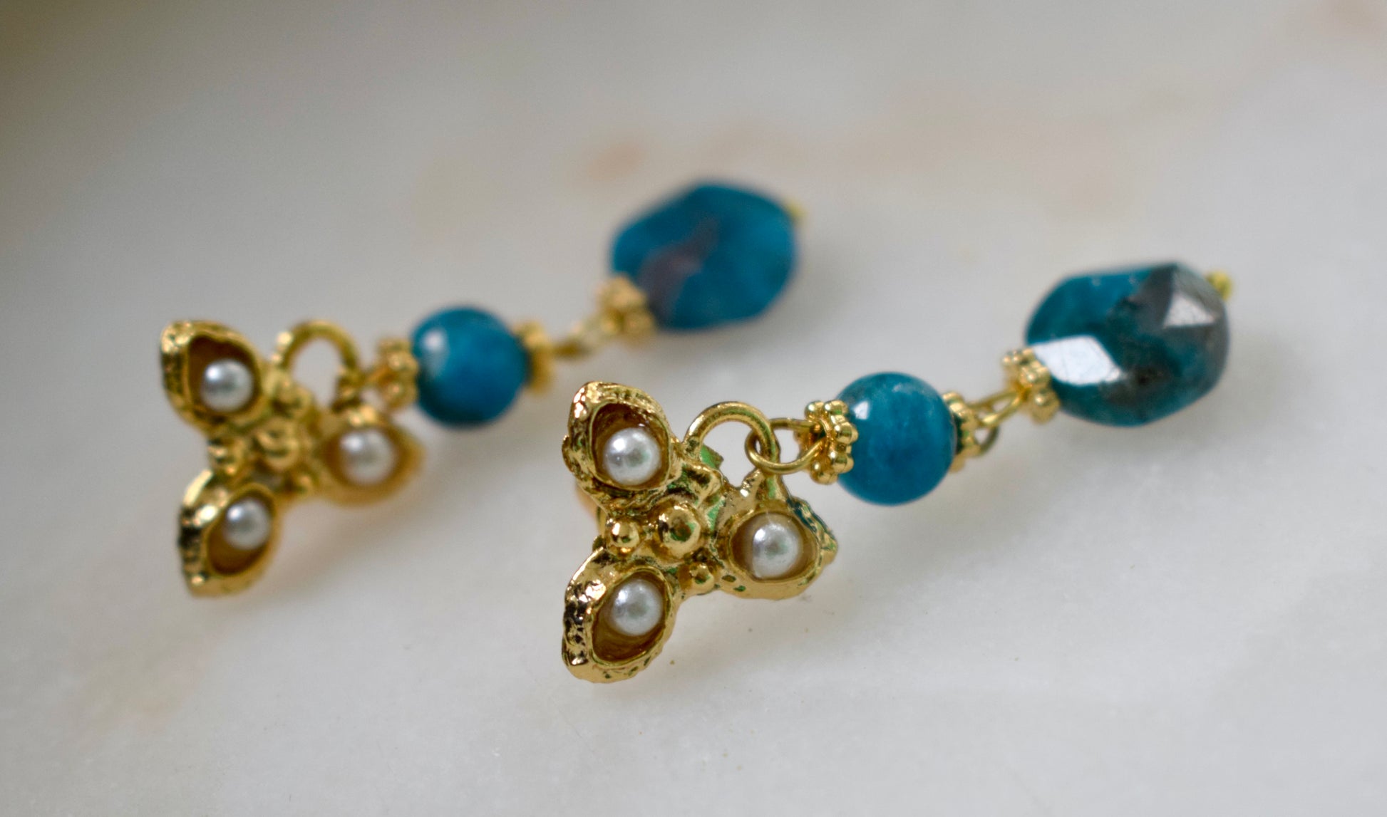 Deze oorbellen hebben iets mystieks. De bovenkant zijn 3 kleine blaadjes met 3 ingelegde echte pareltjes. Achter de blaadjes zitten stekers. De oorbellen liggen dus op het oor. Daaronder zit een bolletje van lapis lazuli een geslepen lapis lazuli van 6 mm. De totale lengte van deze oorbellen is 4,5 cm.