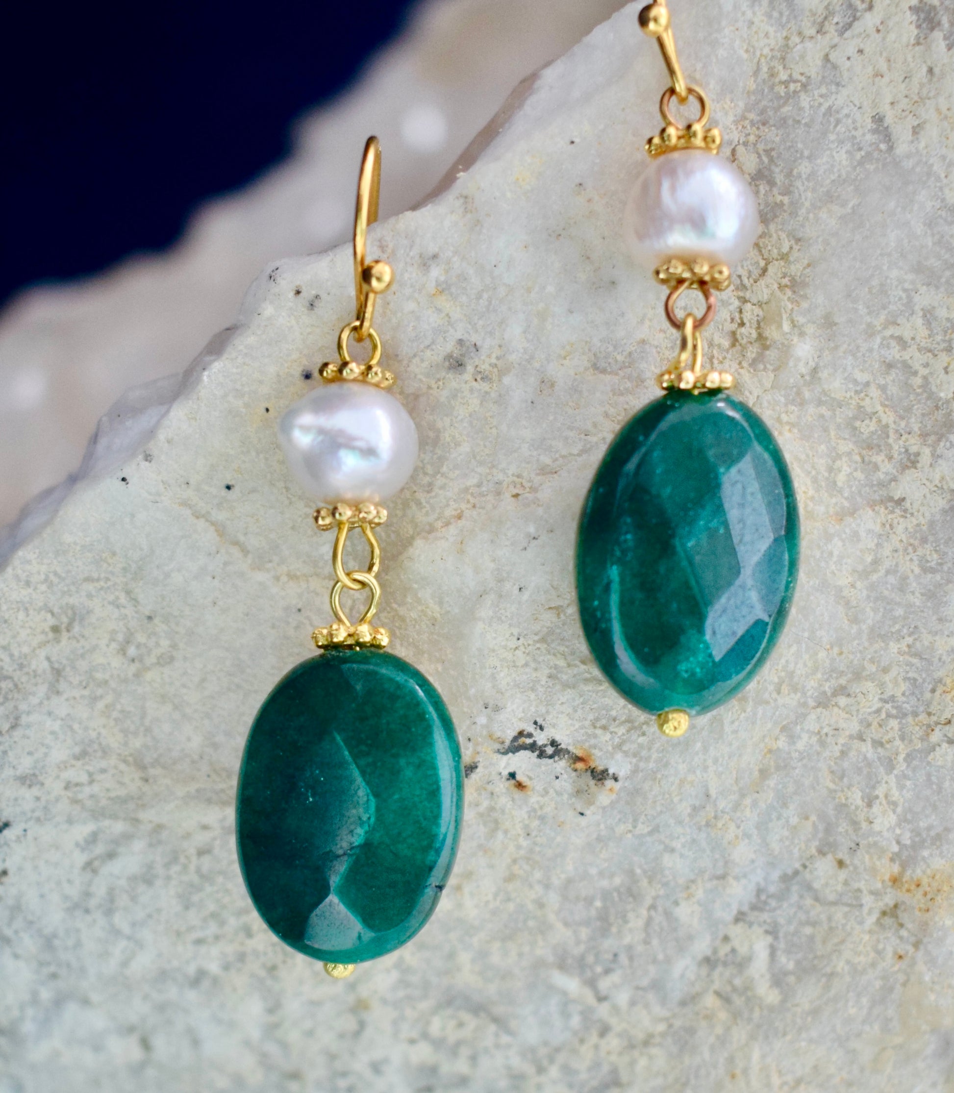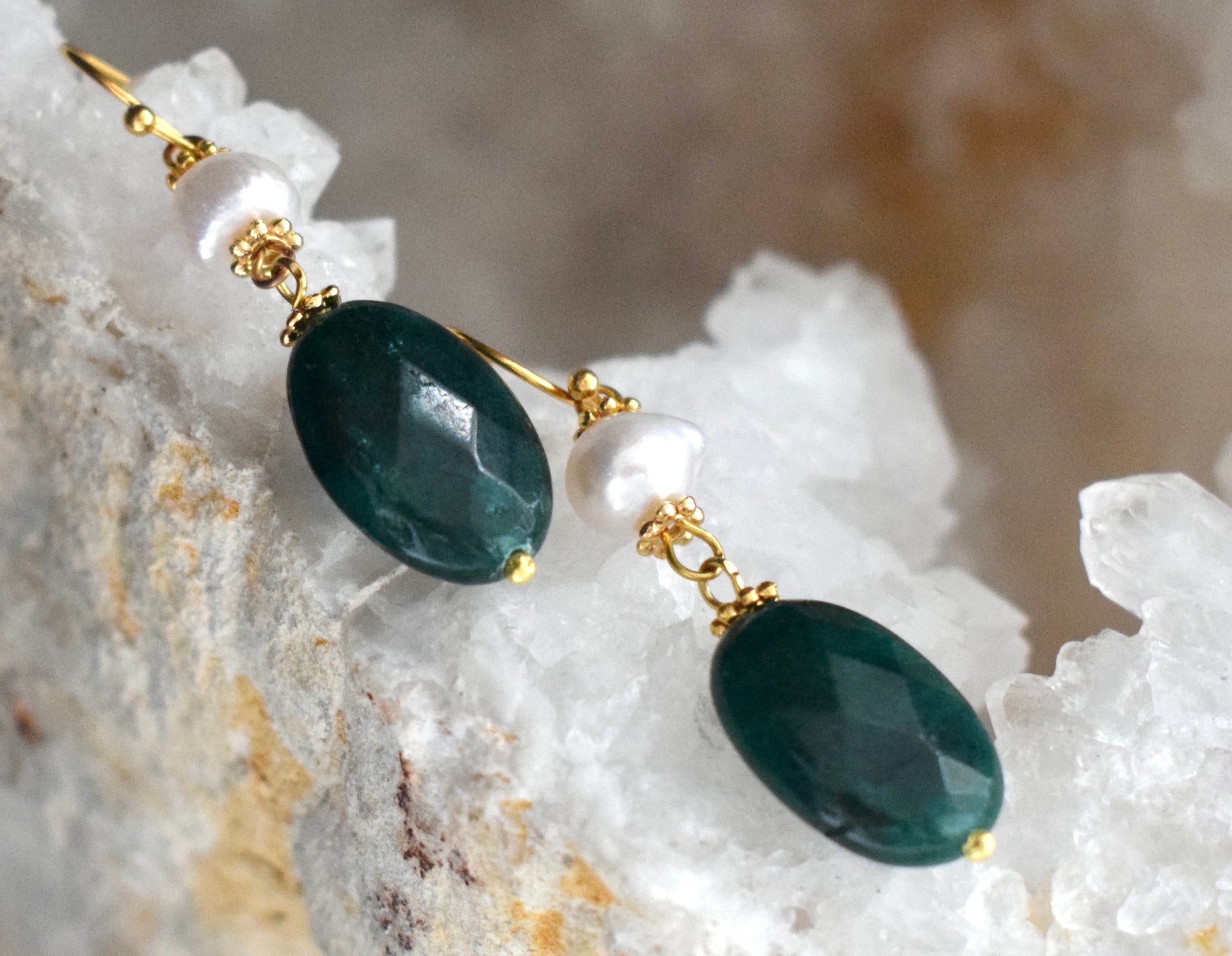 Deze oorbellen zijn verfijnd en sierlijk. Startend met een kleine echte parel versierd met een kroontje van gouden bolletjes en aan het einde hangt een geslepen agaat. De diep groene kleur zorgt voor een prachtige rustige uitstraling. De totale lengte is 4,5 cm. De agaat is 2 cm lang en 1 cm breed.