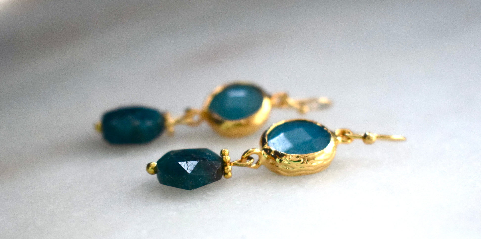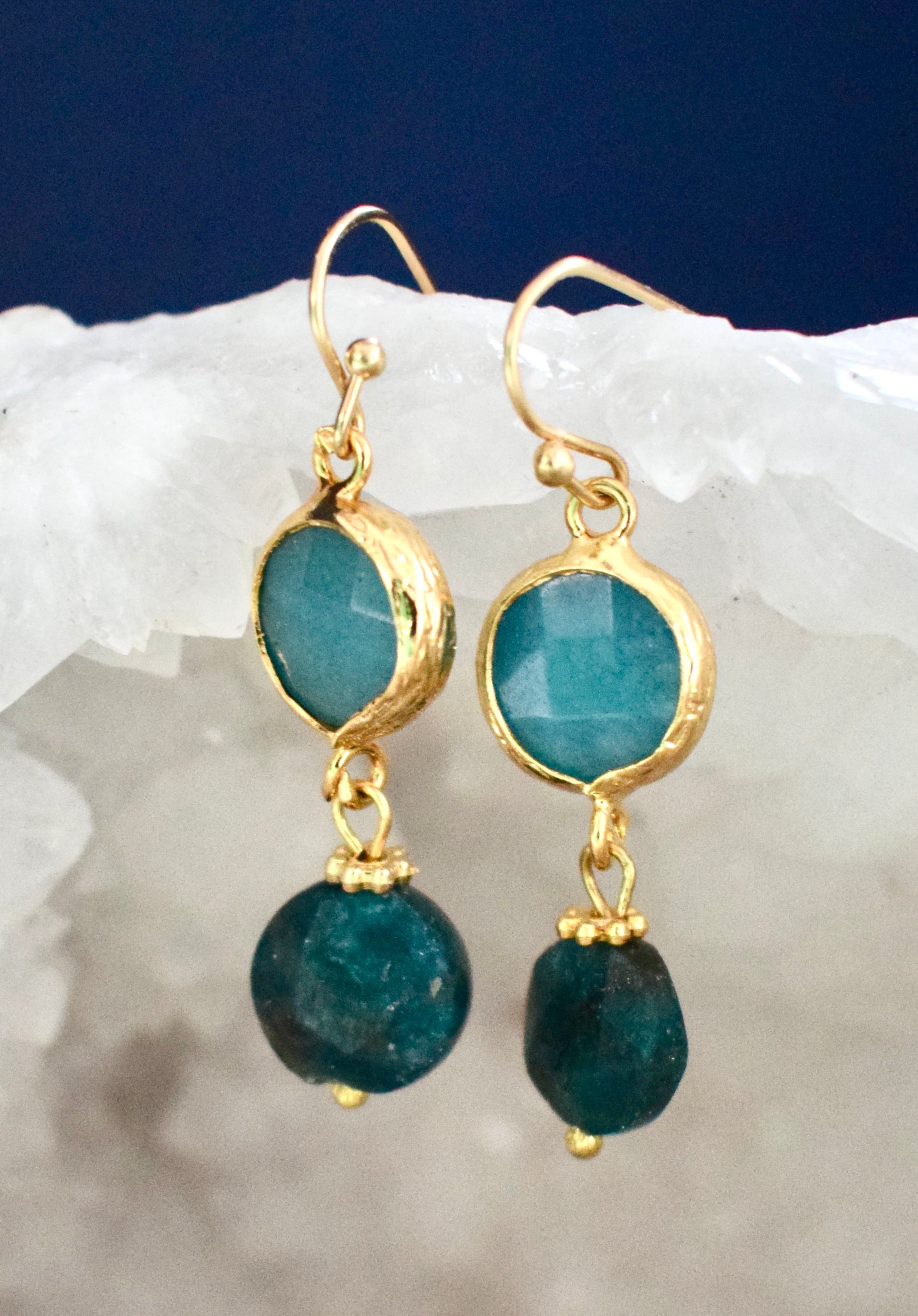 Subtiele en verfijnde schoonheid. Deze oorbellen hebben bovenaan een lapis lazuli van 6 mm. En onderaan een aventurijn van 8 mm in de kleuren blauw/groen. De totale lengte van deze oorbellen is 4 cm.